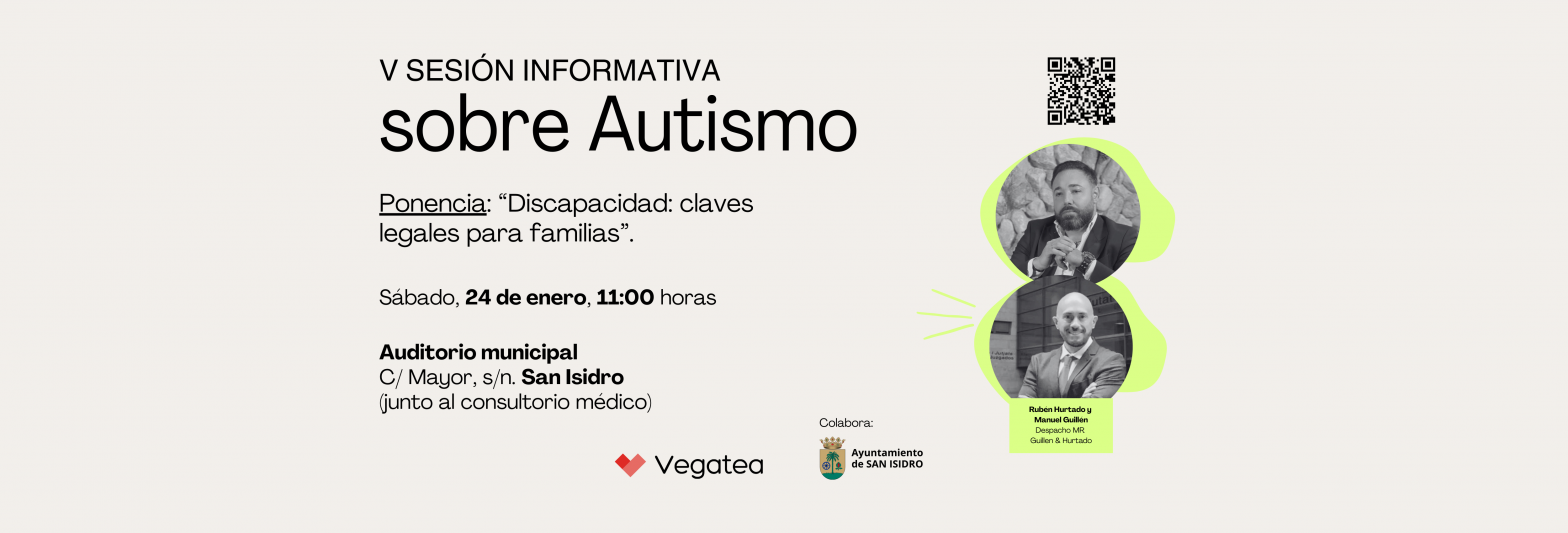 El próximo sábado 24 de enero de 2026, a partir de las 11:00 horas, celebraremos en el Auditorio municipal de San Isidro, calle mayor s/n (junto al consultorio médico), la V Sesión Informativa sobre Autismo, a cargo de Rubén Hurtado y Manuel Guillén, del Despacho MR Guillén & Hurtado, con la ponencia «Discapacidad: claves legales para familias».